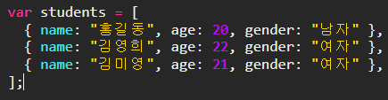{ name: "홍길동", age: 20, gender: "남자" },