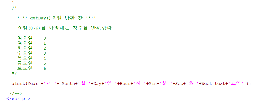 alert(Year +'년 '+ Month+'월 '+Day+'일 '+Hour+'시 '+Min+'분 '+Sec+'초 '+Week_text+'요일' );