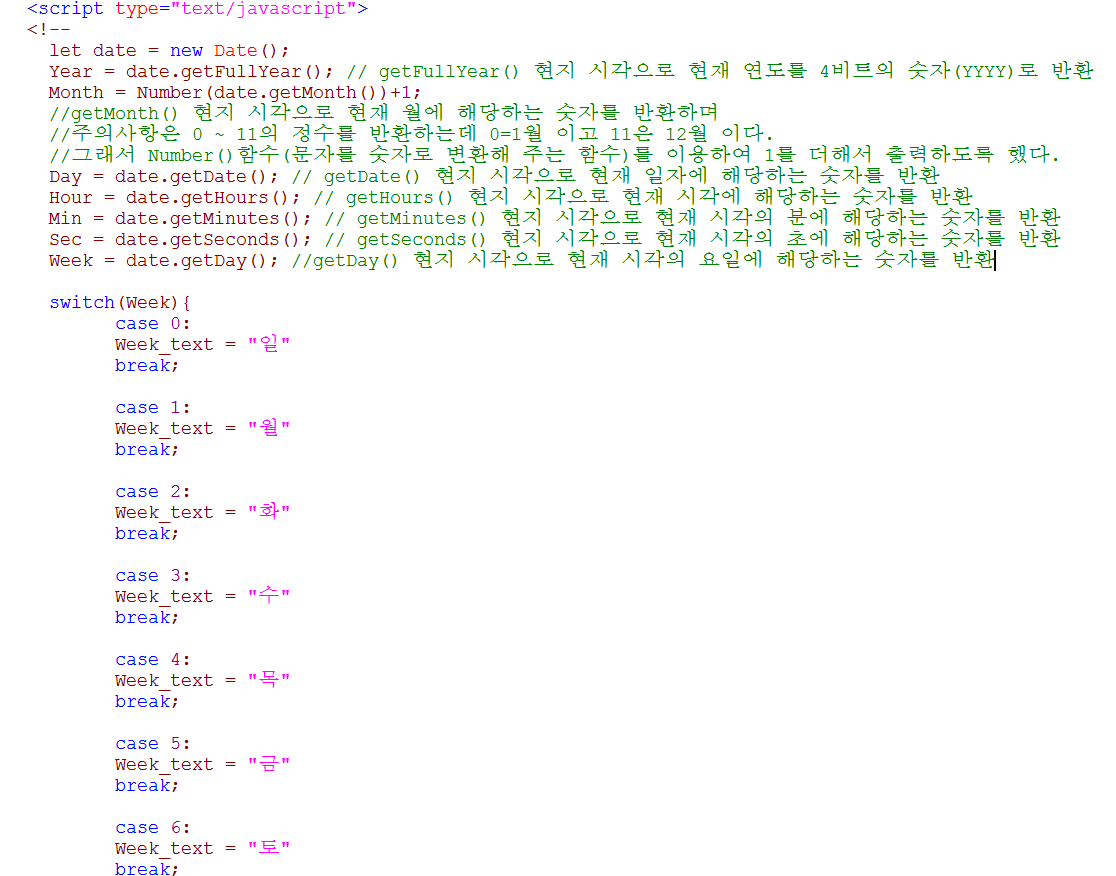 Week = date.getDay(); //getDay() 현지 시각으로 현재 시각의 요일에 해당하는 숫자를 반환