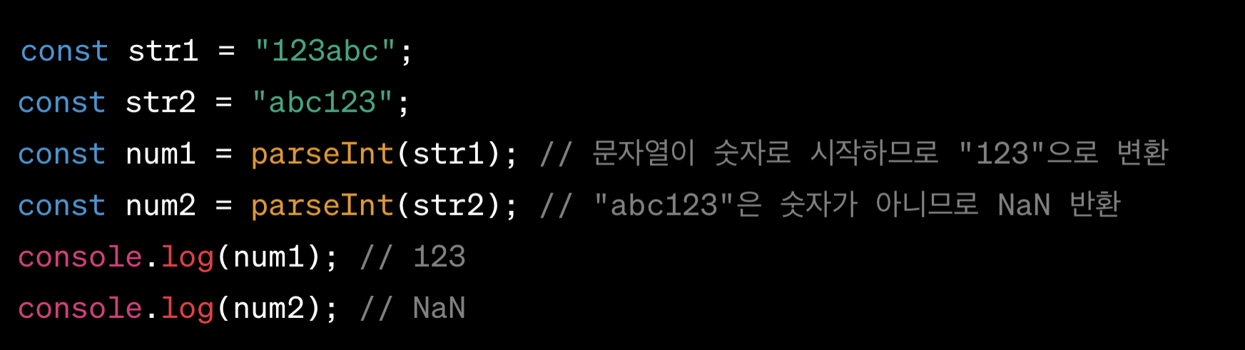const num2 = parseInt(str2); // "abc123"은 숫자가 아니므로 NaN 반환