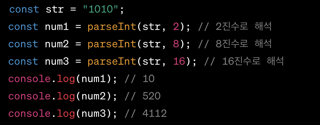 const num1 = parseInt(str, 2); // 2진수로 해석