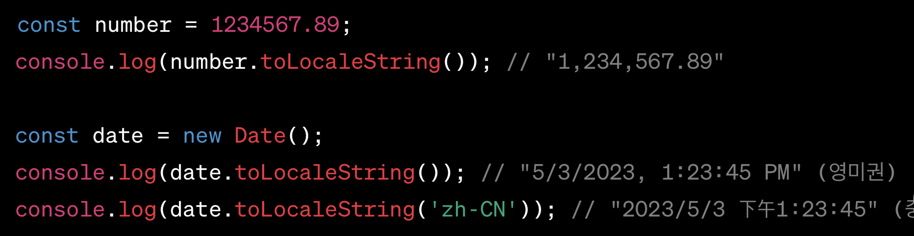 toLocaleString() 숫자와 날짜를 각각 지역화된 문자열로 변환해줍니다. 숫자의 경우, 천 단위마다 구분 기호를 추가하고, 날짜의 경우 지역에 맞는 형식으로 날짜와 시간을 표시합니다.