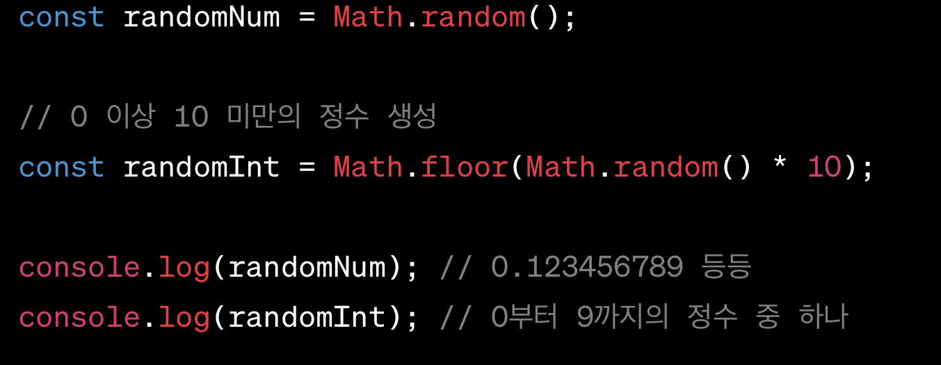 Math.random() : 0 이상 1 미만의 무작위 실수를 반환합니다.