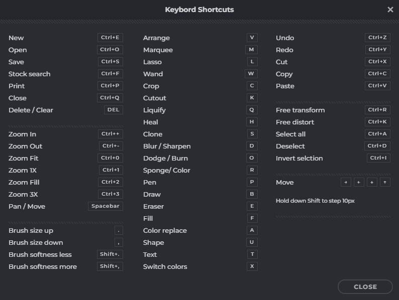 위 그림은 pixlr에서 사용되는 단축키이다.