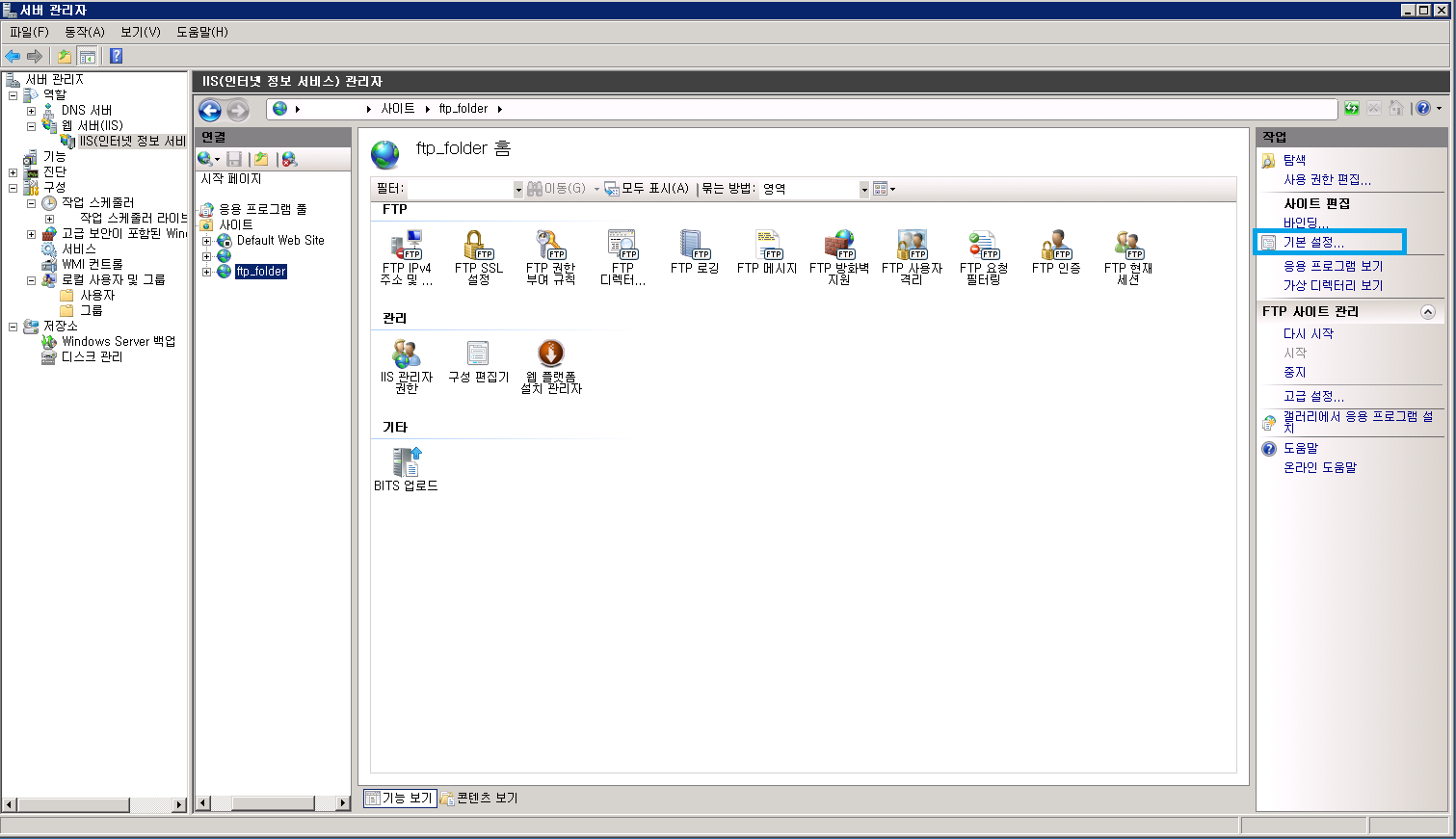 11. 아래 그림과 같이 IIS > ftp_folder를 클릭한 후 기본설정을 클릭한다.