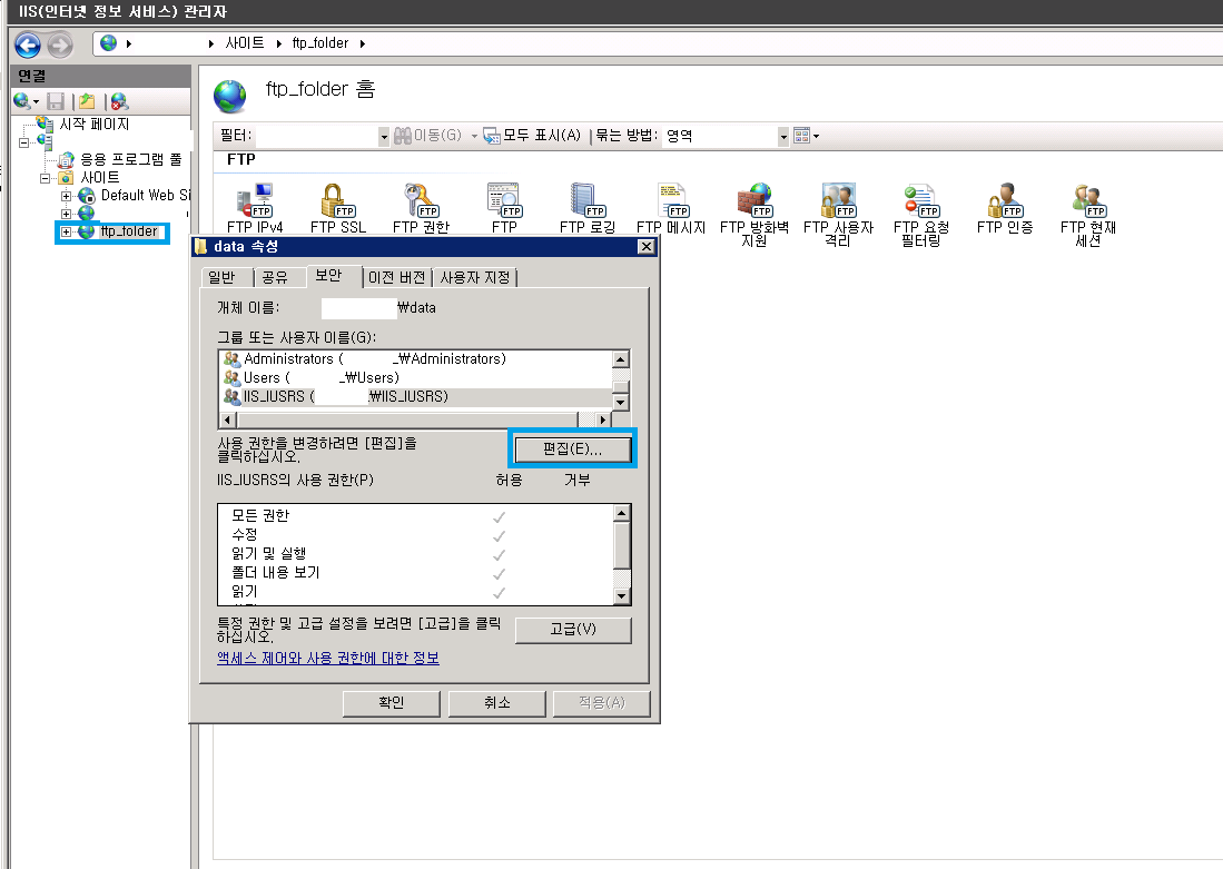 18. IIS > ftp_folder를 클릭 후 오른쪽 버튼 > 팝업 메뉴에 사용 권한 편집을 클릭 후 > 편집 버튼을 누른다.