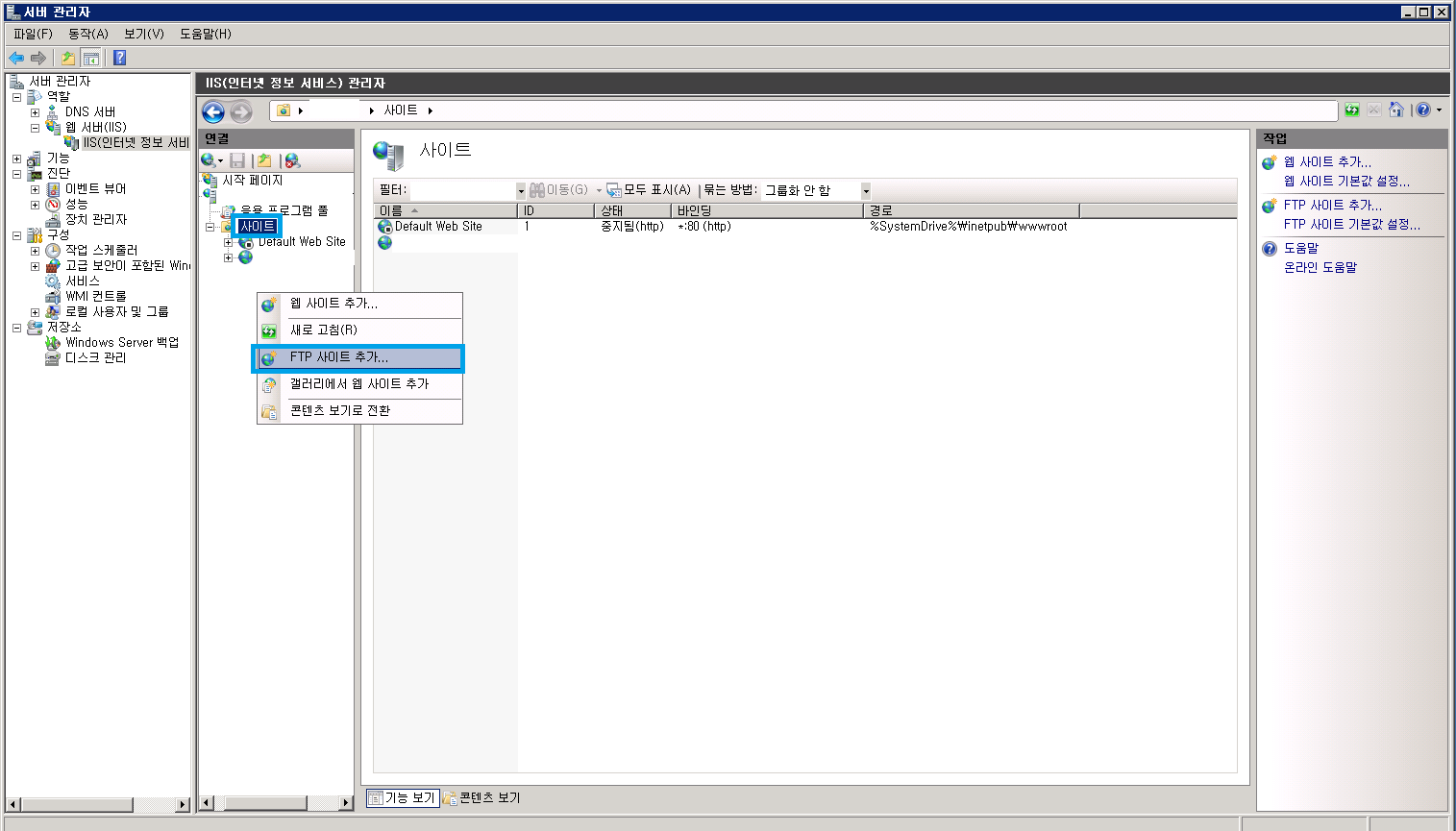 1. FTP 서버 설치하기 시작 > 관리도구 > 서버 관리자 > 웹 서버 (IIS) > 역할 서비스 추가