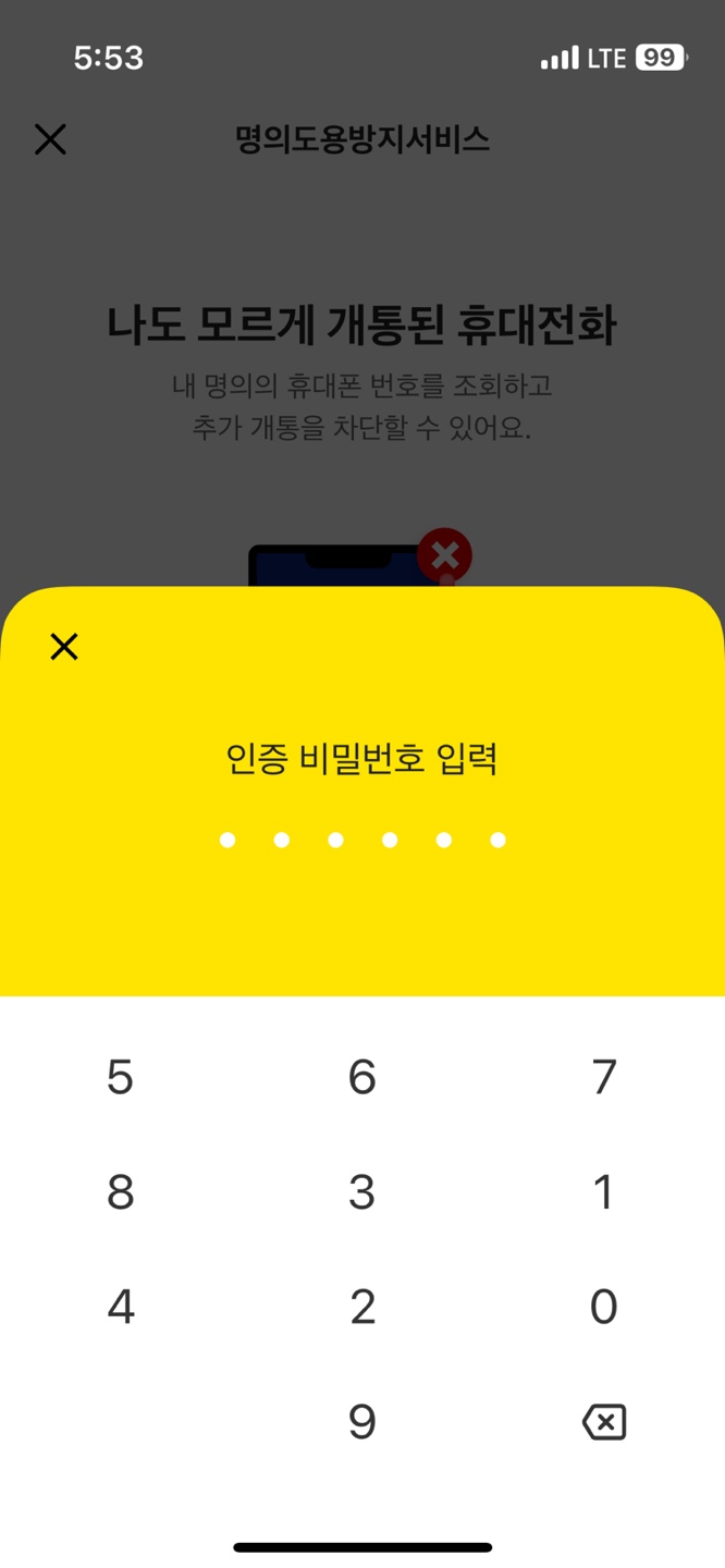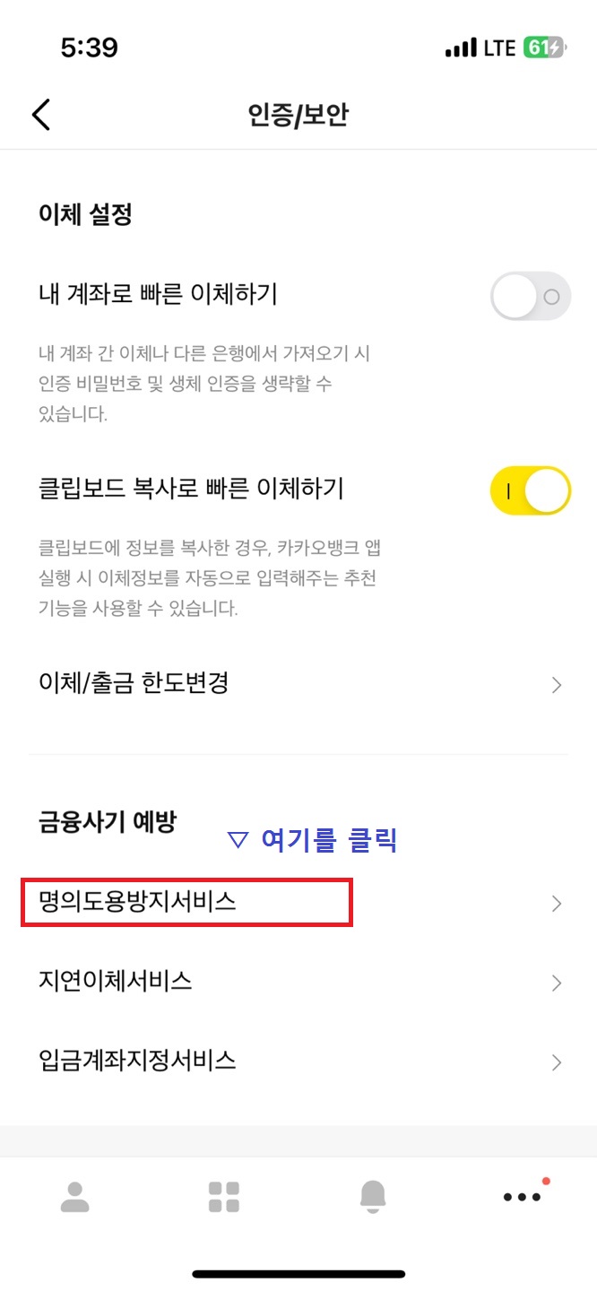 카카오뱅크 앱에서 핸드폰 명의도용방지 신청이 가능하다.