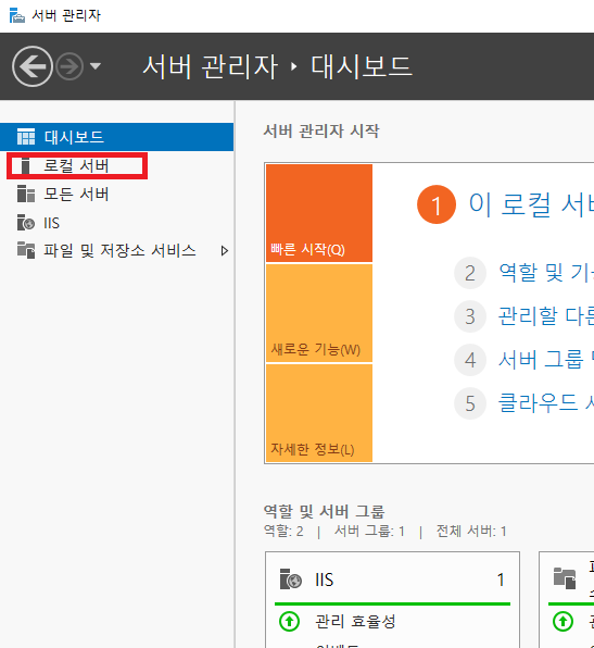 2. 서버관리자 -> 로컬 서버 클릭한다.